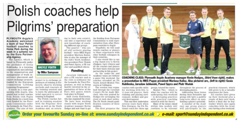 On August 19-25, coaches Mariusz Kalisz, Paweł Spyra, Piotr Wodok and Jarosław Jabłoński participated in training sessions of football clubs in Plymouth on the south-west coast of England. The host club was Plymouth Argyle F.C., playing in the N Power League 2 (4th English league), a club that 8 years ago played in the Championship (2nd league), and in 1984 reached the semi-finals, and in 2007 the quarter-finals of the FA Cup. As part of the training sessions, our coaches had the opportunity to get acquainted with the structure of the club, with the approach to the training process in all age groups, including the first team. Our attention was paid in particular to organizing a football academy at the club. The training system at the club made a great impression on us, in particular the 6-week training program, in which subsequent elements of football craft are introduced and improved for 6 weeks, which is in line with the national syllabus adopted by the English federation. Such a system is missing in Polish football and there is a lot to look at in this field.